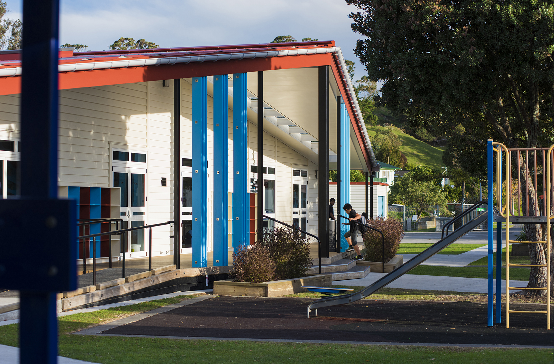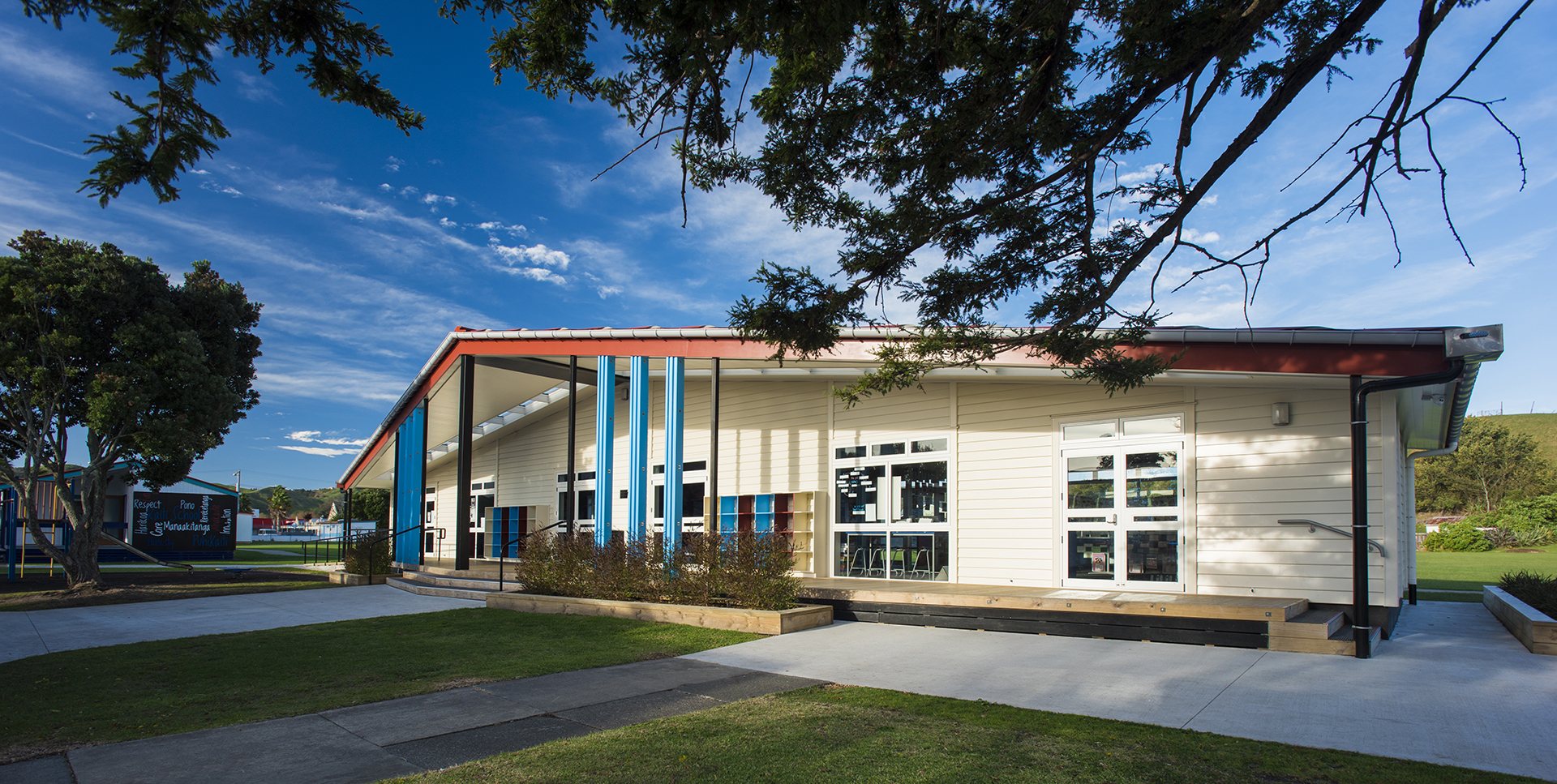 Teachers and students adore their new wharenui-like classroom block at Kaiti School, in Gisborne. The block was designed to the current Ministry of Education ILE Design Guidelines, and local tikanga was woven through the design.