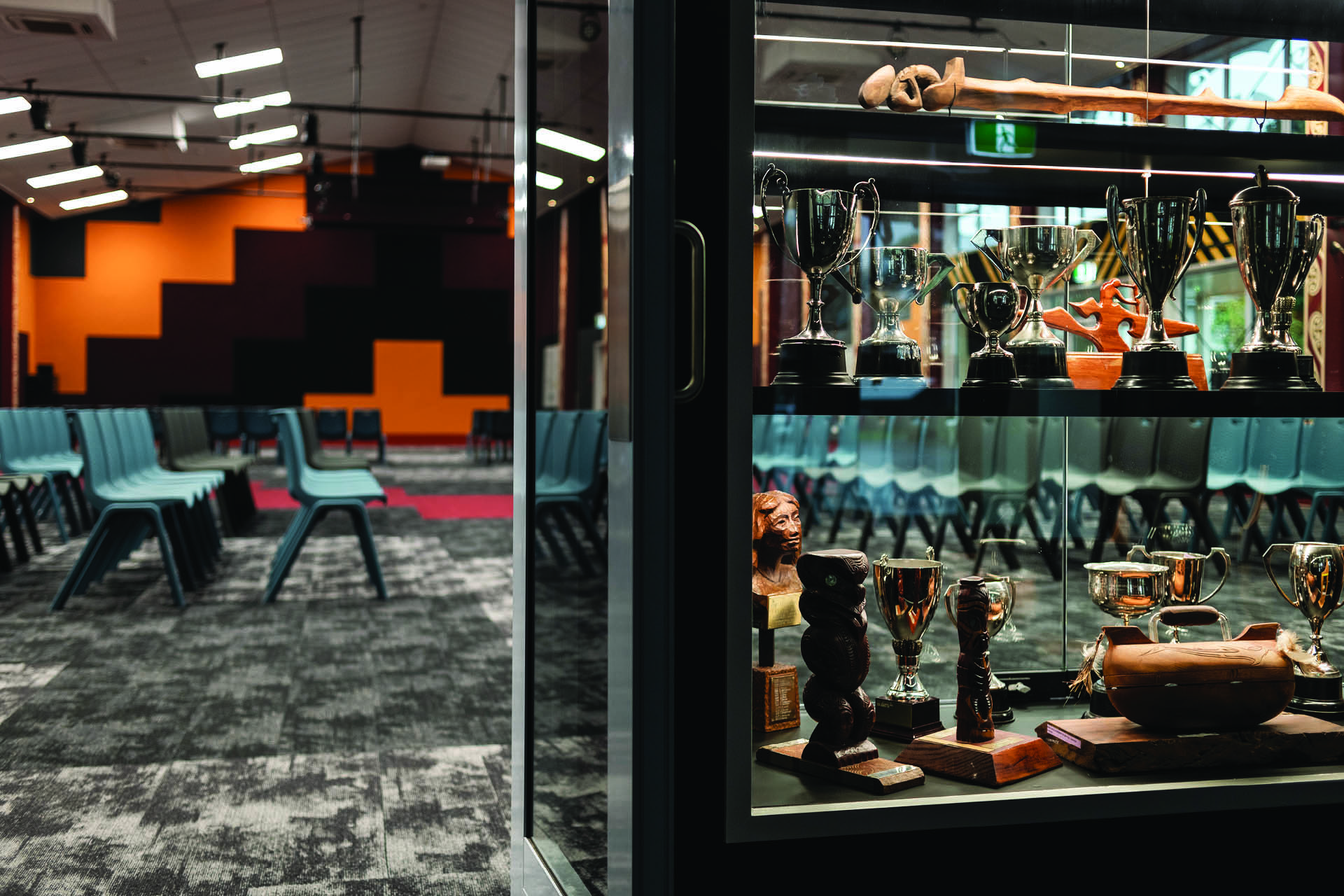 This plainness provides a dramatic contrast to the interior. The entrance foyer has had the ceiling raised and has dark moody black walls, representing the night. The doorways into the hall frame a new black trophy cabinet with discrete LED lighting and together with the new honours boards provide an inspirational entrance for students and community. The hall has had the stage removed to create a much larger flexible space. The walls have been lined with Autex Composition in patterns designed by artist Simon Lardelli telling the story of the morning light rising in the east over rippling waters that are represented in the carpet tiles.