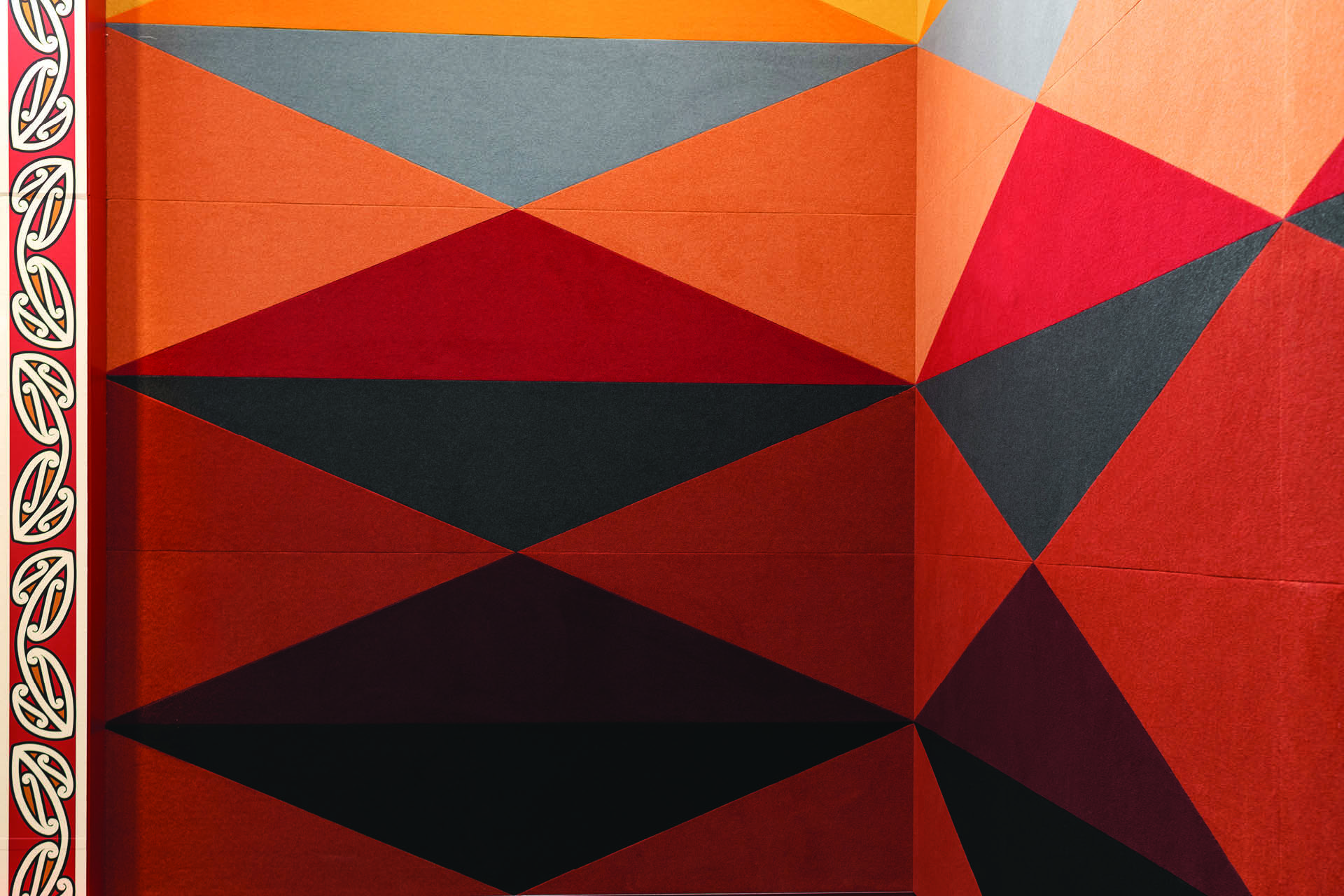 The western end (former stage end) of the hall signifies the setting sun and striving for higher things through the use of the Poutama pattern. Linking the eastern and western ends of the hall is a striking black and yellow pattern on the walls. The carpet is Inter Tile from Jacobsen Flooring and the wall patterns have been carefully set out to align with the carpet and connect these walls together. Simon has also designed new window decals for the upper windows to continue the story telling.