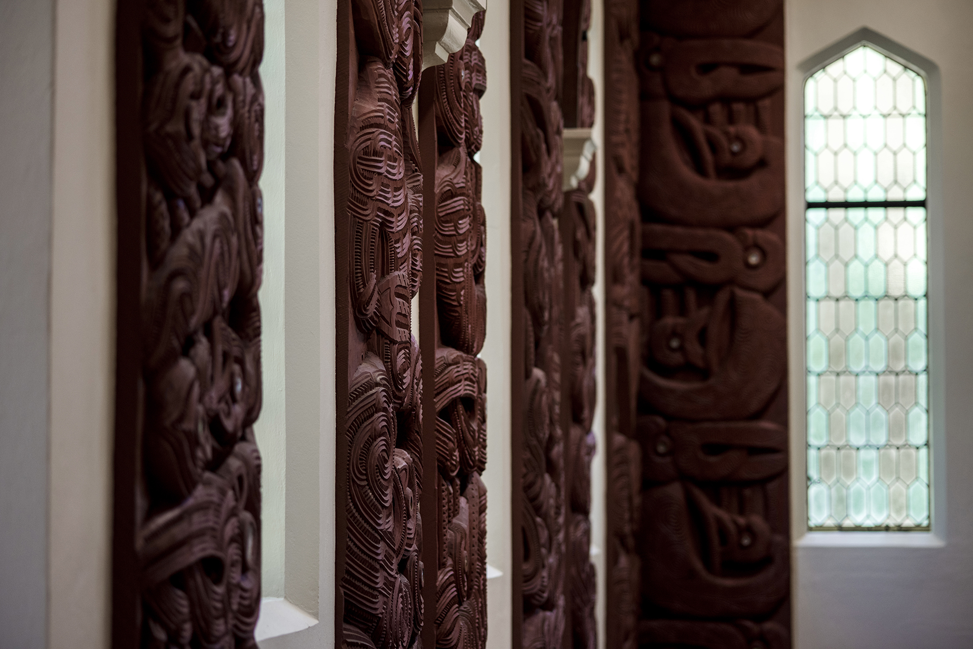 … this discreet structural upgrade retains the integrity of the original building. Carbon-fibre, inserted behind exceptional whakairo (carved wooden panels) helps bring the church up to code.
